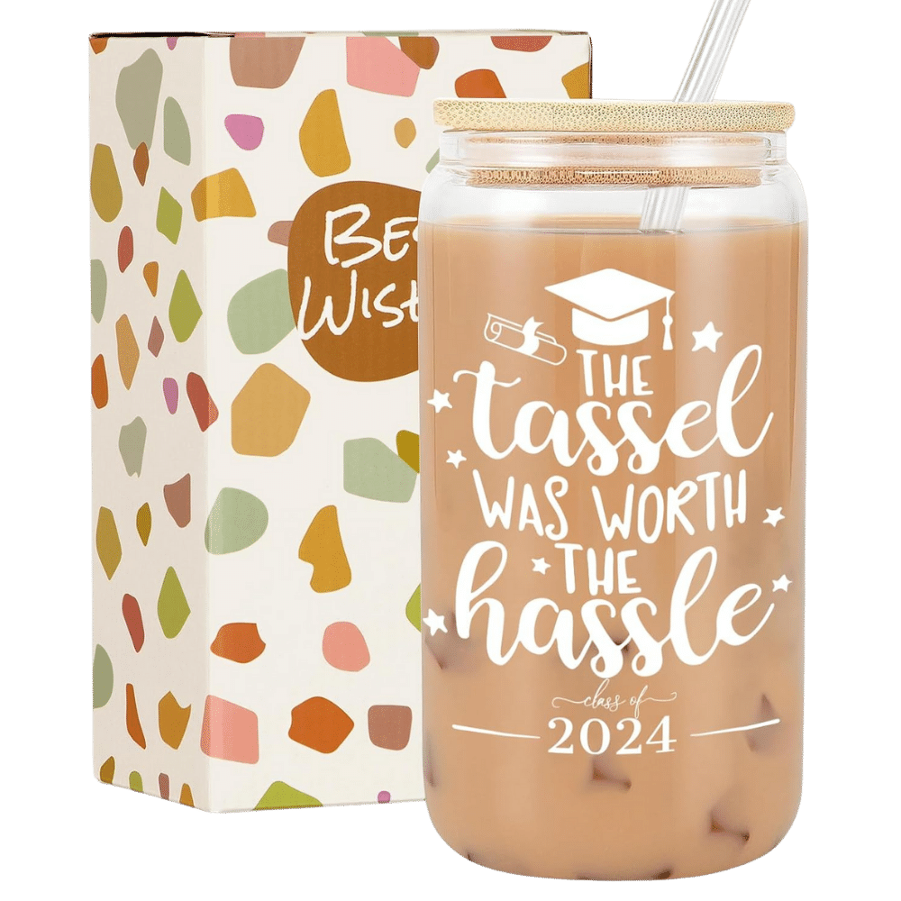 The Frerdui "The Tassel Was Worth The Hassle" Glass Coffee Cup makes a thoughtful and practical gift for graduates. Its elegant design features a celebratory message, perfect for highlighting their achievement. Crafted from high-quality, durable glass, this coffee cup is both stylish and functional.