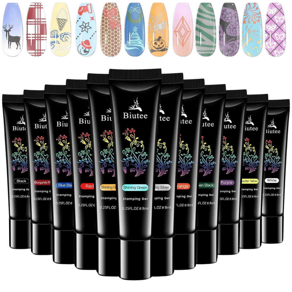 The Biutee Stamp Nail Polish Gels set brings an explosion of color to your fingertips with its selection of 12 vivid hues.