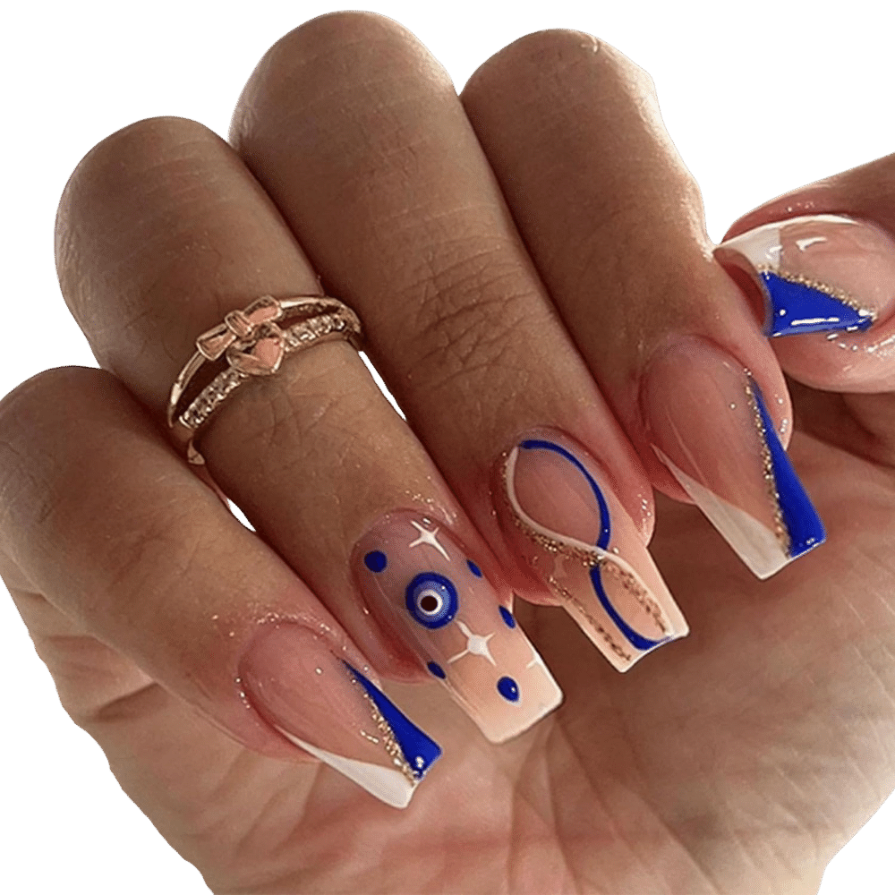 Applying Evil Eye Nails is easy and straightforward. Start by cleaning and drying your natural nails thoroughly. Then, select the correct size of Evil Eye Nail for each finger and apply a small amount of nail glue to the back of the artificial nail. Press the Evil Eye Nail firmly onto your natural nail for about 10-20 seconds to ensure strong adhesion. Repeat for each nail.