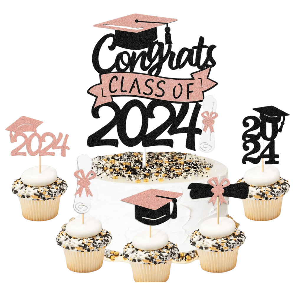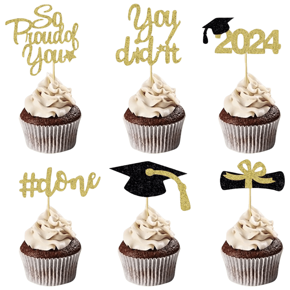 Celebrate your graduate's achievements with the Ohiviaaa Congrats Class of 2024 Cupcake Topper. This charming topper boasts a refined design, showcasing the congratulatory message in elegant gold glitter lettering. Made from safe, non-toxic materials, it ensures both quality and safety for your celebratory treats.