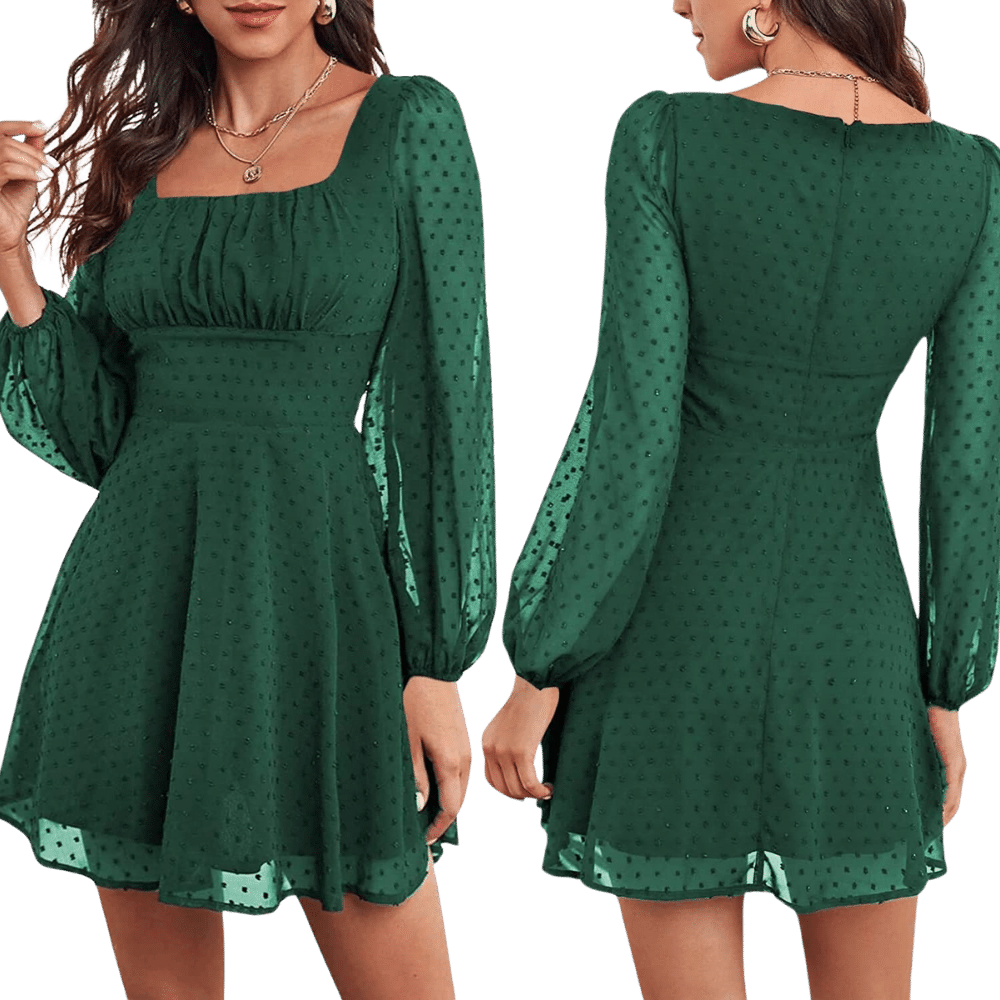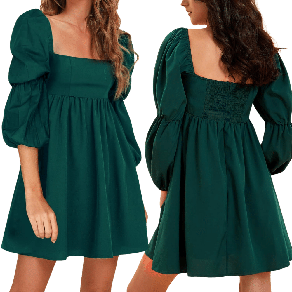The EXLURA Women’s Square Neck Puff Sleeve A-Line Mini Dress is a delightful blend of elegance and charm.