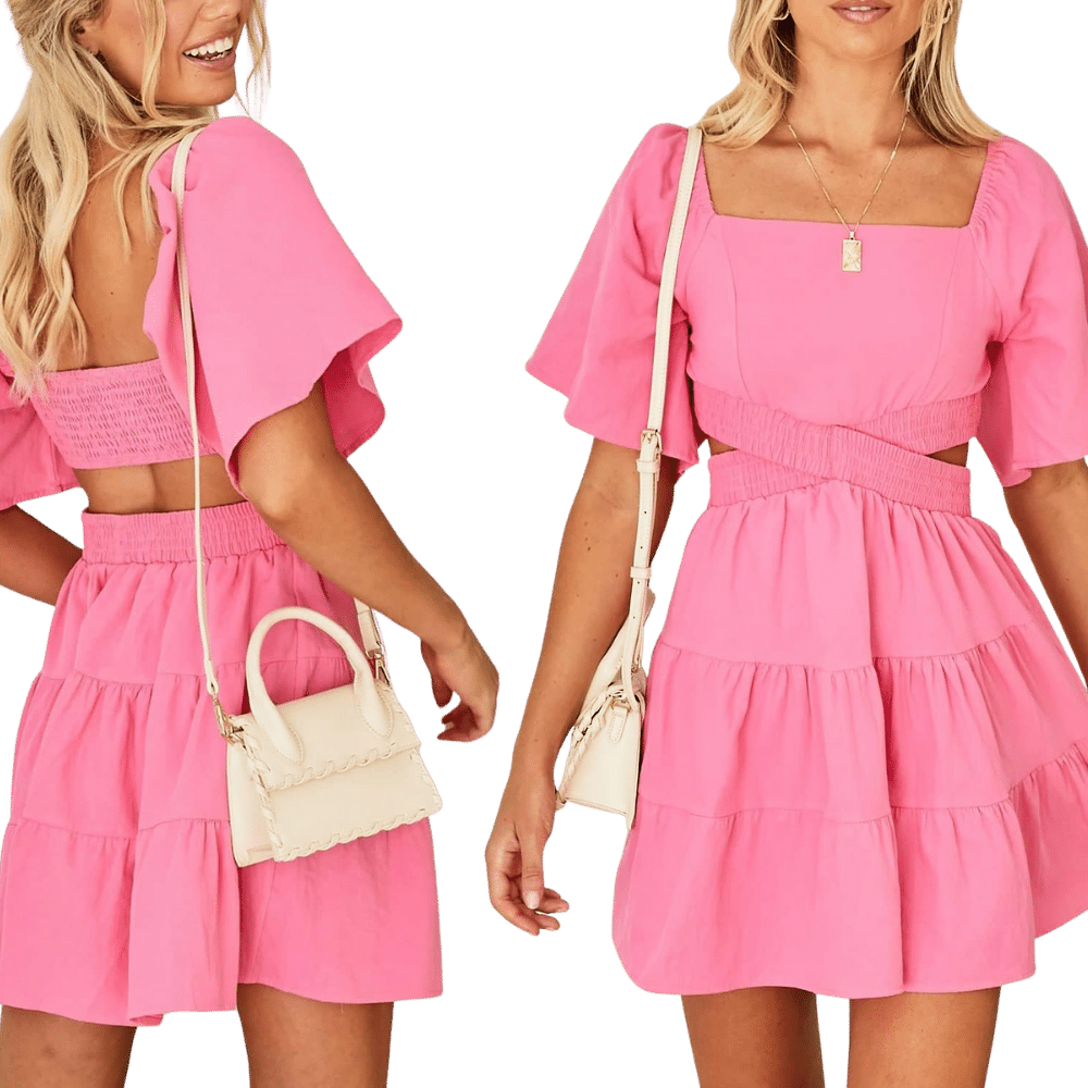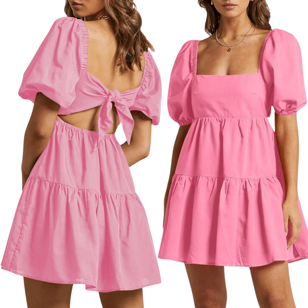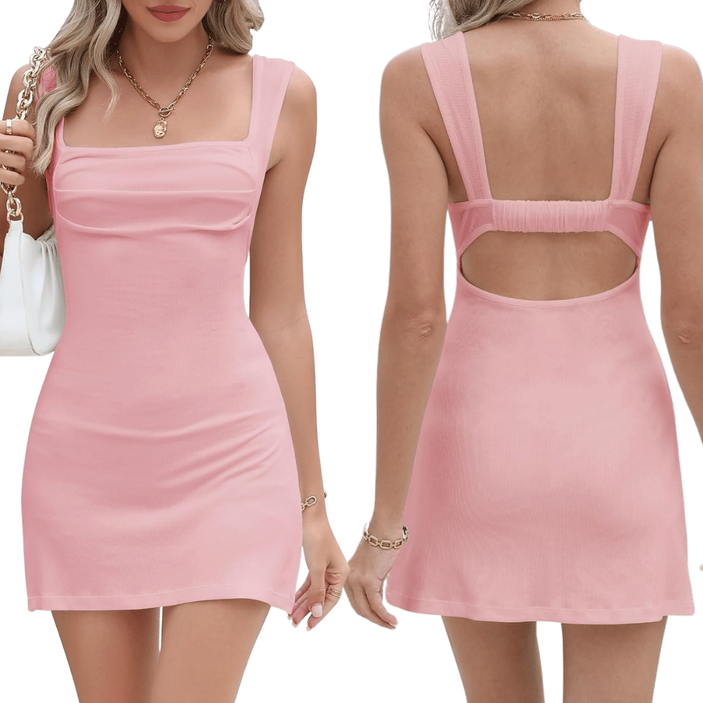 Learn more about the SHESEEWORLD Square Neck Backless Tie Waist Mini Dress here.