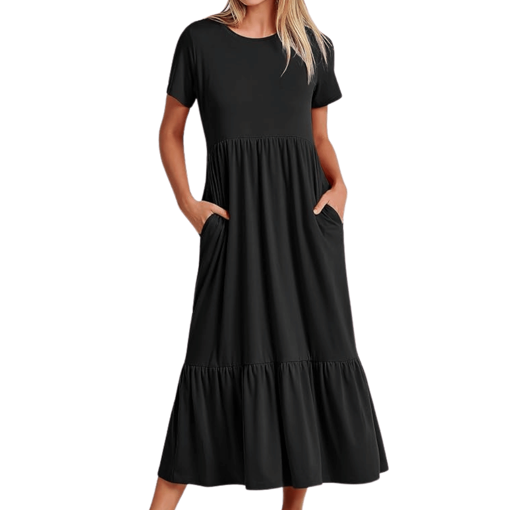 The ANRABESS Women’s Casual Short Sleeve Flowy Tiered Long Dress is suited for those who prefer a more relaxed style. This dress features short sleeves and a tiered design, adding a touch of elegance to your casual summer wardrobe. The flowy skirt allows for a good range of movement all day long, making it ideal for you to choose.