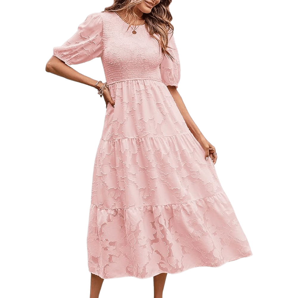 The puff sleeves and flowy skirt add a romantic flair, perfect for garden parties or brunch dates. The tiered layers of skirt effortlessly transition into each other, making this maxi dress look all the more amazing. The subtle floral lace print elevates this dress more and makes it a great fit to add to your stock of maxi dresses.